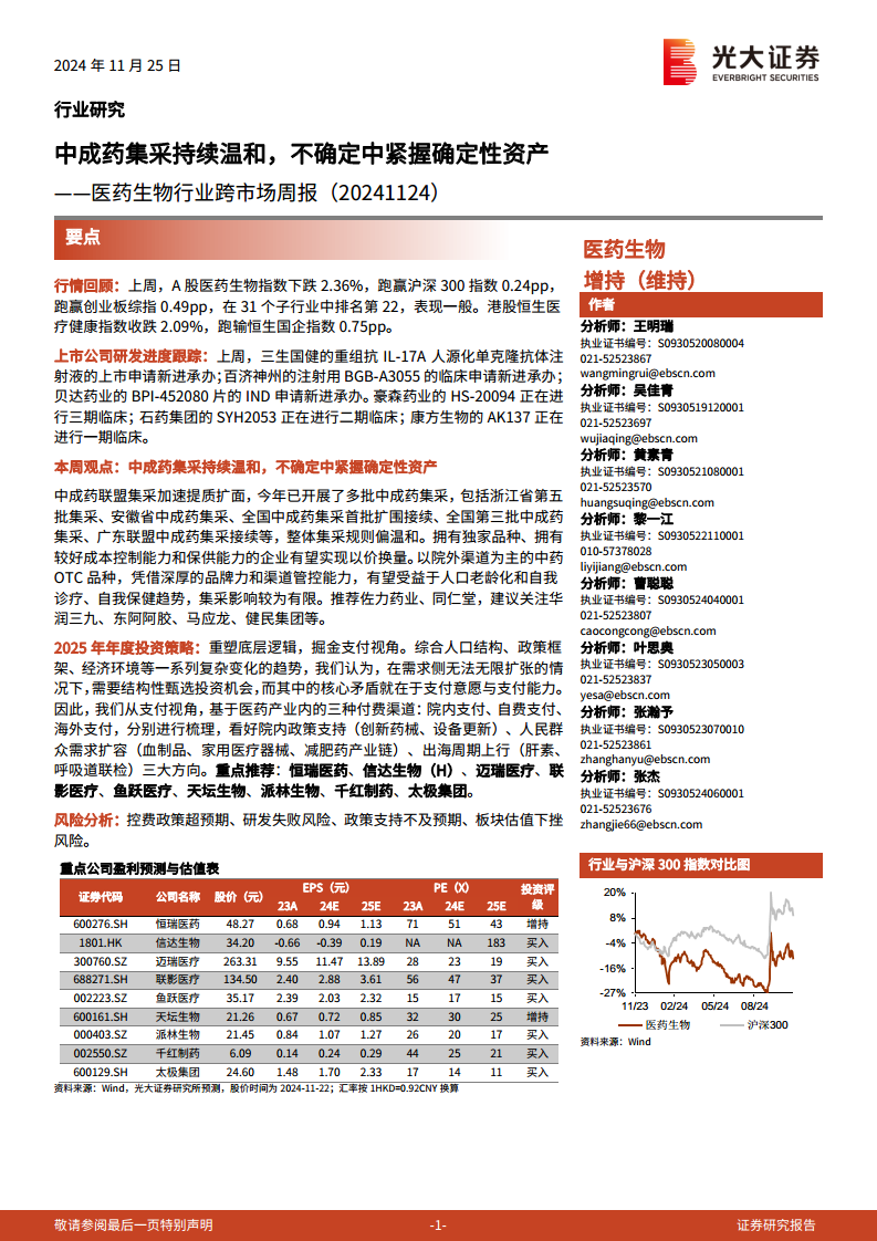 医药生物行业跨市场周报(20241124):中成药集采持续温和,不确定中紧握确定性资产