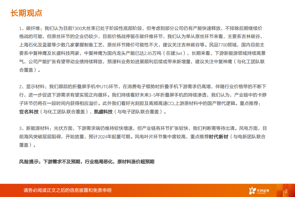 在碳纤维领域,T300大丝束产品已处于阶段性底部,但产能释放可能导致价格战。原丝环节因技术壁垒高,企业数量少,降价可能性不大,建议关注吉林碳谷。民品T700领域,中复神鹰作为国内龙头,产能持续扩张,受益于下游新能源领域的高景气度,预浸料业务有望带来新增量。 显示材料方面,折叠屏手机需求持续高增,伴随价格带下行,市场渗透率有望进一步提升。产业链中的“卡脖子”环节将获得溢价。同时,光刻胶及高频高速CCL上游原材料的国产替代逻辑受到看好,重点推荐世名科技、凯盛科技。 新能源材料中,光伏行业下游需求增速快,但各环节扩张迅速,需等待市场出清。风电特别是海风领域,在突破阻碍后开始放量,预计2024年起量可期,风电叶片环节集中度高,推荐时代新材。报告提示了下游需求不及预期、行业格局恶化和原材料涨价超预期等风险。