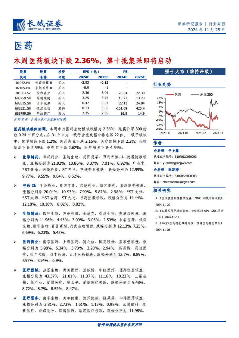 本周(2024年11月18日至11月22日)医药生物板块整体呈现回调态势,申万医药生物板块下跌2.36%,但在31个申万一级行业中排名第22位,跑赢沪深300指数0.24个百分点,显示出一定的韧性。尽管短期市场受政策和宏观因素影响,但报告强调医药行业已传递出筑底向上、持续修复的信号,预计行业景气度将稳步复苏。