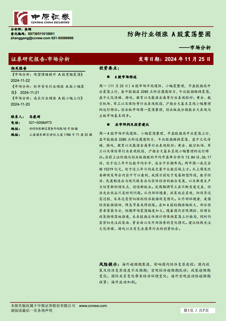 本报告分析了2024年11月25日A股市场冲高遇阻、小幅震荡整理的走势,指出市场内部存在结构性热点,如文化传媒、游戏、教育和能源金属等行业表现突出。通过对当前上证综指(13.84倍)和创业板指数(36.17倍)平均市盈率以及两市成交金额(15219亿元)的分析,报告认为市场估值处于近三年中位数水平,具备中长期布局价值。宏观层面,国内经济转型升级、新质生产力培育以及逆周期调节政策的持续发力,为市场提供了长期支撑。尽管外部环境(美国降息节奏放缓)和短期获利了结可能导致市场波动加剧,但报告预计未来股指将保持震荡上行趋势。建议投资者短线关注文化传媒、游戏和有色金属等行业的投资机会,并持续关注政策、资金及外部因素变化。