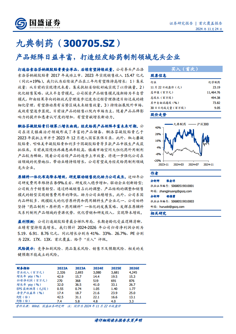 九典制药凭借其在经皮给药制剂领域的深厚积累和创新能力,已成功打造出洛索洛芬钠凝胶贴膏这一“黄金单品”,并辅以酮洛芬凝胶贴膏等丰富的产品梯队,构筑了强大的市场竞争力。公司通过优化销售策略、拓展院外市场以及原辅料一体化布局,实现了业绩的稳健增长和盈利能力的持续提升。面对中国庞大的慢性疼痛市场和经皮给药制剂的巨大潜力,九典制药凭借其先发优势、持续的研发投入和多元化的产品储备,有望进一步巩固其在经皮给药制剂领域的龙头地位,并在未来几年实现持续高增长。国盛证券基于对公司核心产品放量、新产品上市以及费用结构优化的预期,给予公司“买入”评级,看好其长期发展前景。