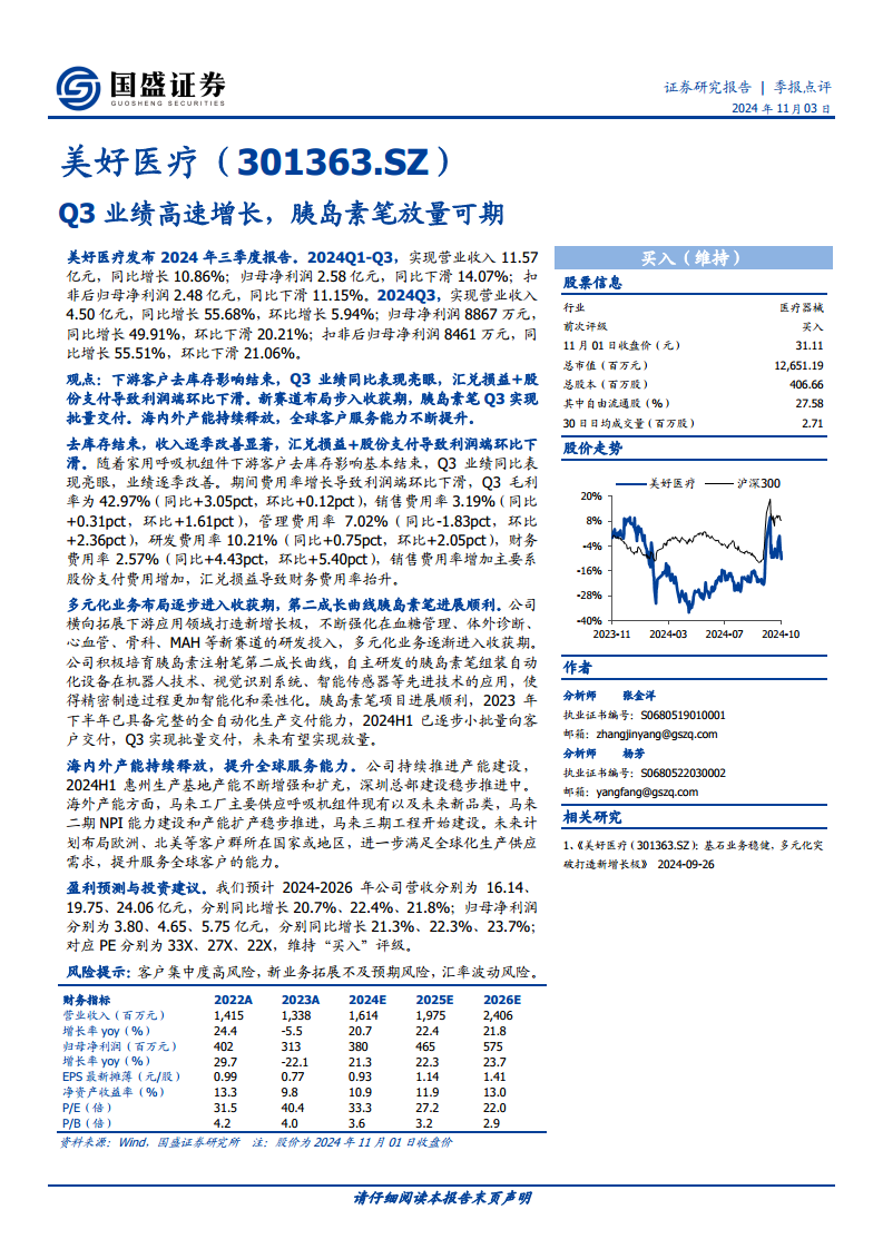 美好医疗(301363):Q3业绩高速增长,胰岛素笔放量可期