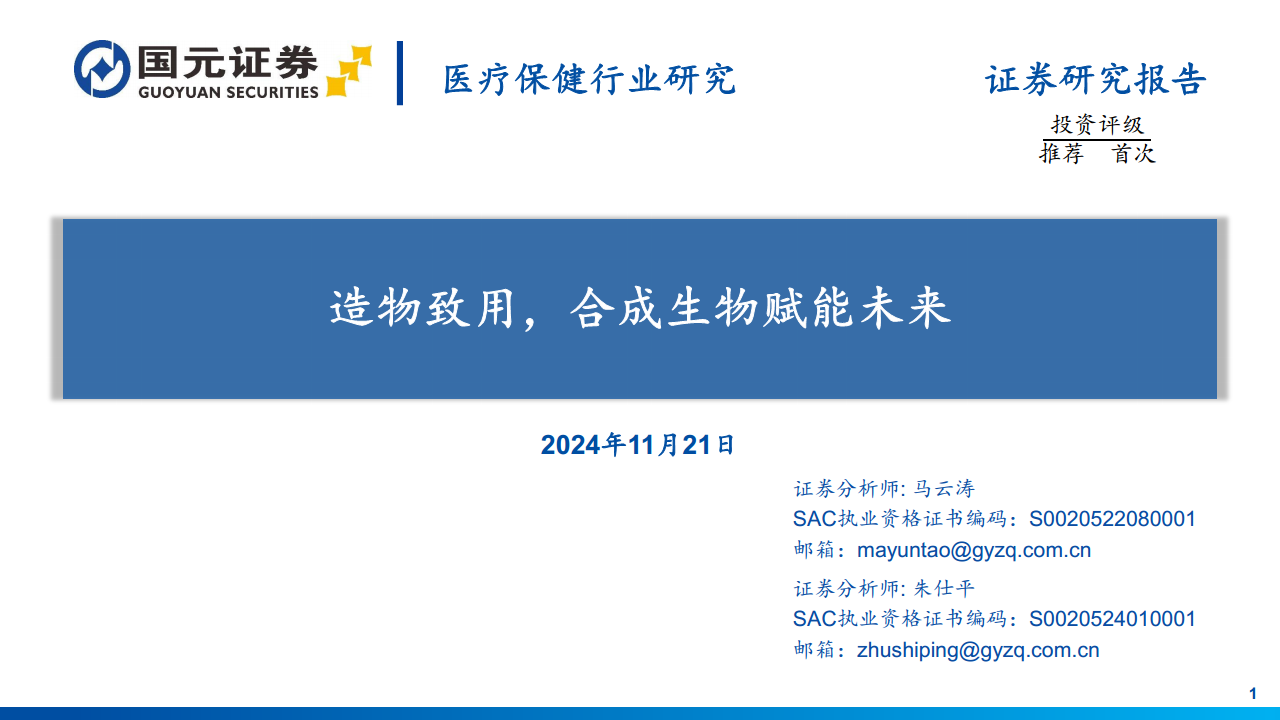 医疗保健行业研究投资评级推荐首次:造物致用,合成生物赋能未来