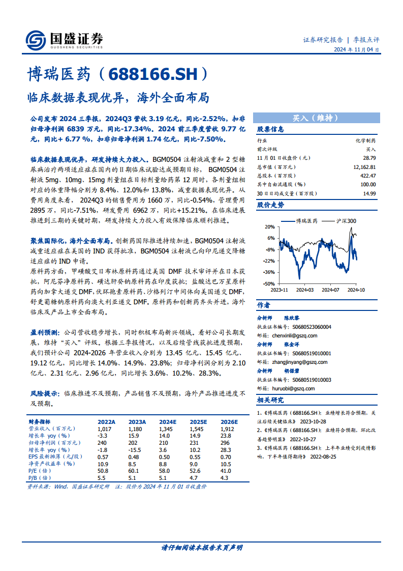 国盛证券维持对博瑞医药的“买入”评级。根据三季报情况及后续管线获批进度预期,分析师预计公司2024年至2026年的营业收入将分别达到13.45亿元、15.45亿元和19.12亿元,同比增长率分别为14.0%、14.9%和23.8%。同期,归母净利润预计分别为2.10亿元、2.31亿元和2.96亿元,同比增长率分别为3.6%、10.2%和28.3%。报告同时提示了临床推进不及预期、产品销售不及预期以及海外产品推进进度不及预期等风险。