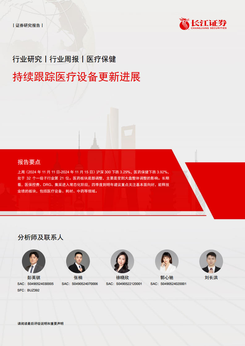 本报告分析了近期医药保健行业的市场表现、政策影响及投资机会。上周医药板块随大盘调整,年初至今跑输沪深300指数23.5个百分点。在医保控费、DRG和集采常态化背景下,报告建议投资者重点关注基本面向好、能释放业绩的板块,特别是医疗设备、耗材和中药等院内刚需品种。