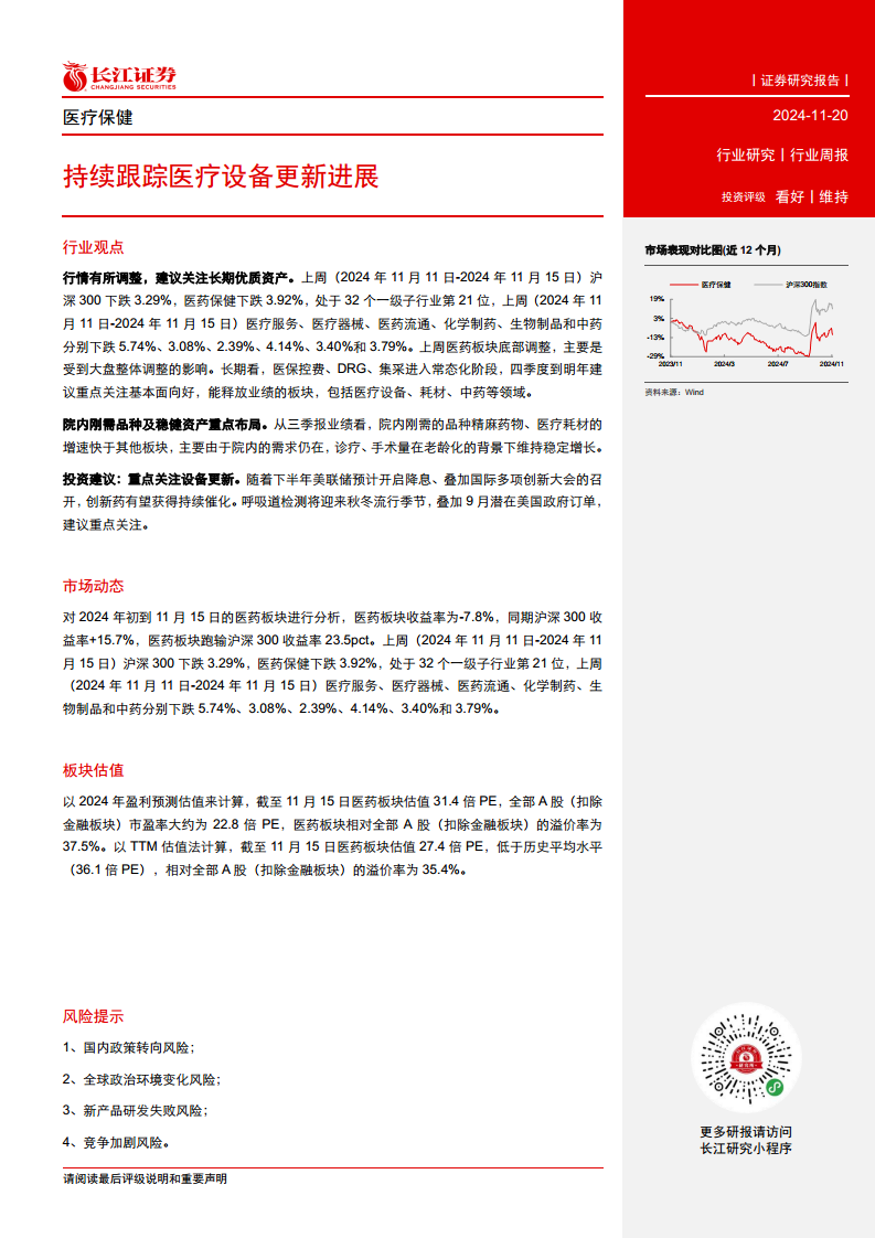 报告强调了医疗设备更新的逐步落地,尽管2024年10月整体招采金额和数量同比有所下降,但CT和核磁共振等大型设备的招采金额环比呈现增长态势。此外,医药板块当前的估值(2024年盈利预测PE为31.4倍,TTM估值27.4倍)低于历史平均水平(36.1倍PE),且相对全部A股(扣除金融板块)存在溢价,表明在市场调整后,优质资产可能存在估值修复的潜力。
