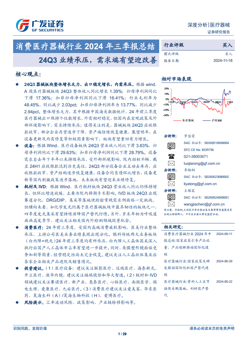 消费医疗器械行业2024年三季报总结:24Q3业绩承压,需求端有望迎改善