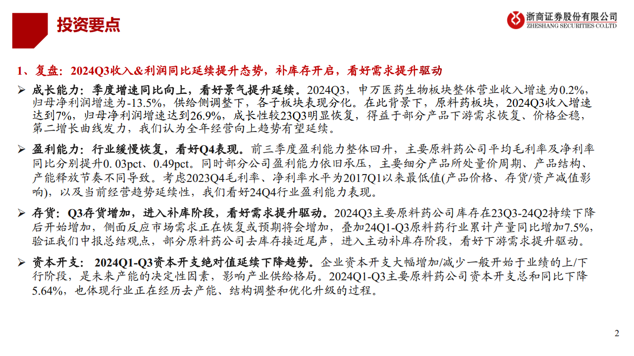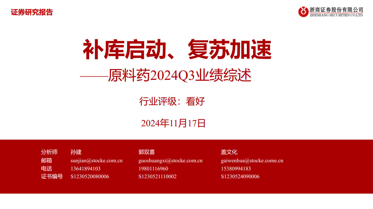 原料药2024Q3业绩综述:补库启动、复苏加速