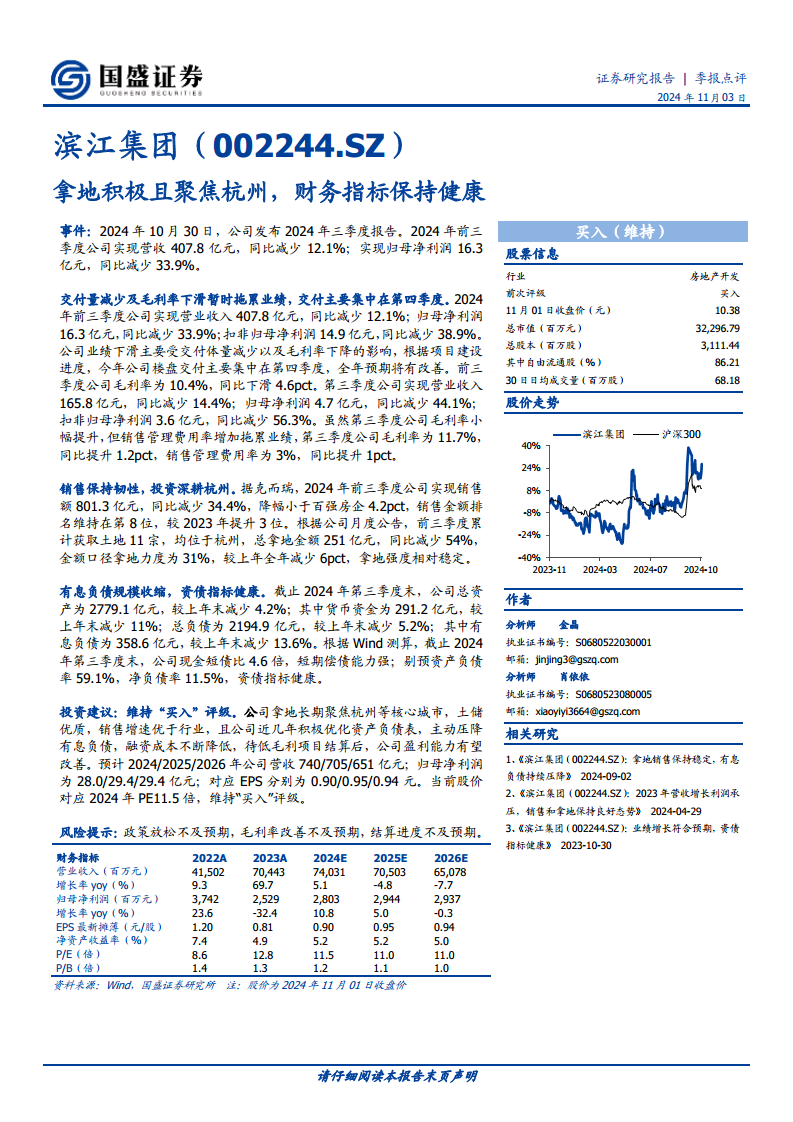 滨江集团2024年前三季度业绩受交付节奏和毛利率影响出现短期下滑,但其销售表现仍优于行业平均水平,且持续深耕杭州核心区域,确保了优质的土地储备。公司财务状况稳健,有息负债持续压降,各项偿债指标健康。展望未来,随着第四季度交付高峰的到来以及低毛利项目结算完毕,公司盈利能力有望逐步改善。基于其战略聚焦、优质土储和健康的财务结构,国盛证券维持其“买入”评级,并预计未来几年营收和归母净利润将保持稳定增长。投资者需关注政策、毛利率和结算进度等潜在风险。