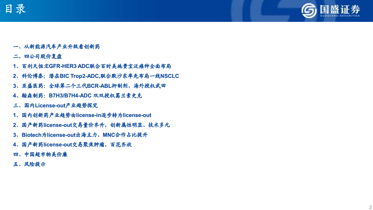 本报告选取了四家在License-out方面表现突出的中国创新药企进行股价复盘,以例证产业升级带来的市场积极反馈。