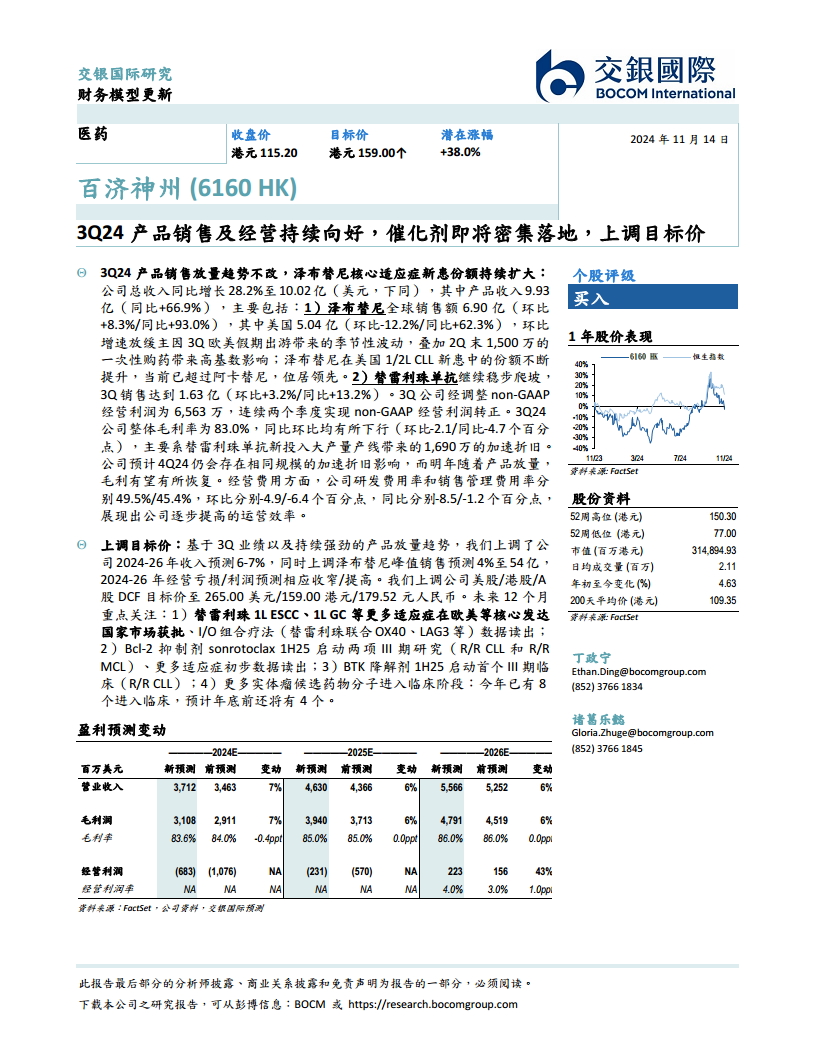 基于百济神州2024年第三季度强劲的业绩表现以及核心产品持续稳健的放量趋势,交银国际对公司的财务预测进行了全面上调。报告将公司2024年至2026年的收入预测上调了6%至7%。具体来看,2024年营业收入新预测为3,712百万美元,较前预测3,463百万美元上调7%;2025年营业收入新预测为4,630百万美元,较前预测4,366百万美元上调6%;2026年营业收入新预测为5,566百万美元,较前预测5,252百万美元上调6%。