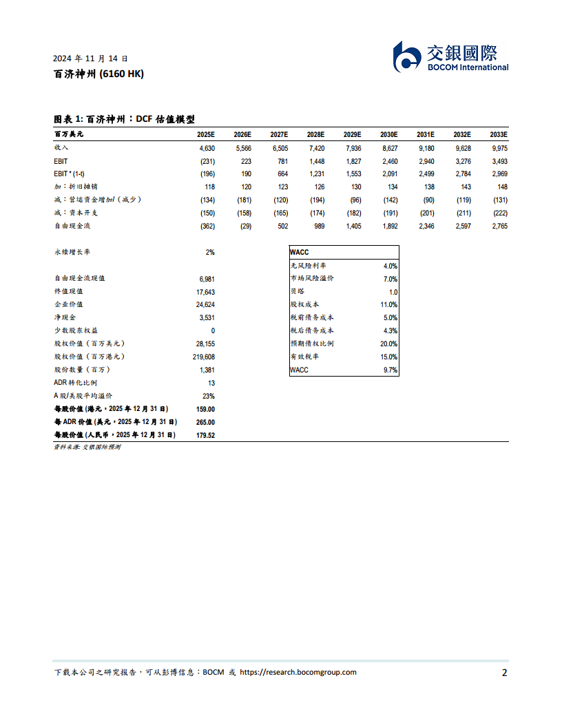 根据DCF模型计算,百济神州的股权价值(百万美元)为28,155,对应股份数量(百万)为1,381。最终,交银国际上调了公司美股/港股/A股的DCF目标价,分别至265.00美元/159.00港元/179.52元人民币。以港股为例,新的目标价159.00港元较当前收盘价115.20港元具有38.0%的潜在涨幅,维持“买入”评级,彰显了分析师对公司未来股价表现的积极预期。
