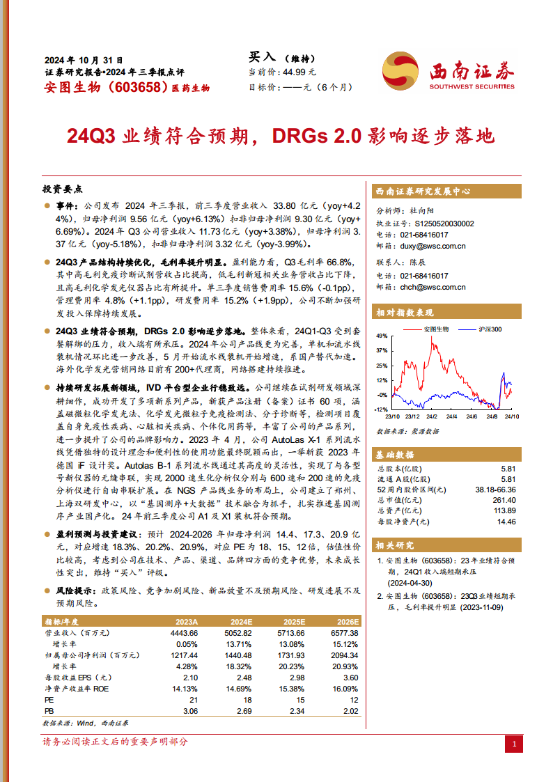 安图生物(603658):24Q3业绩符合预期,DRGs2.0影响逐步落地