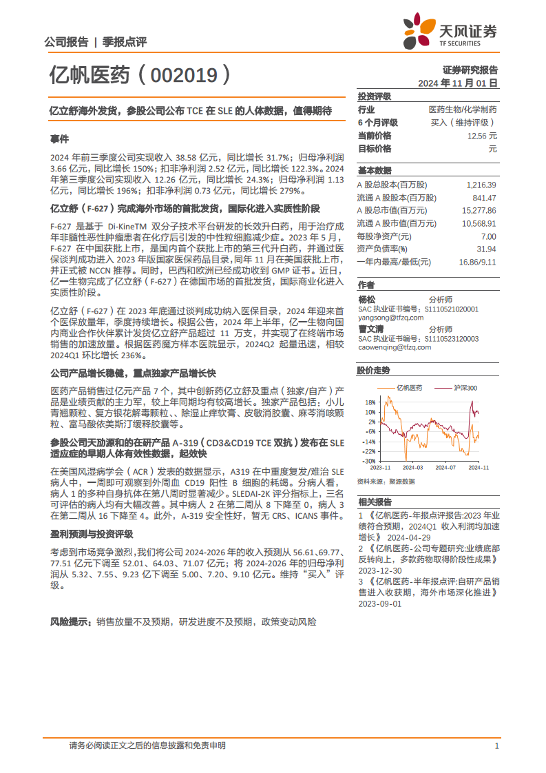 亿帆医药在2024年前三季度实现了强劲的财务增长,营收和归母净利润同比大幅提升,主要得益于创新药亿立舒(F-627)在国内市场的加速放量和重点独家产品的稳健贡献。亿立舒已成功启动海外发货,标志着公司国际化战略进入实质性阶段。此外,参股公司天劢源和的在研产品A-319在系统性红斑狼疮(SLE)适应症上展现出积极的早期人体数据,具有快速起效和良好安全性的特点,且在全球同类靶点药物中处于领先地位,为公司未来发展增添了新的增长点。尽管分析师基于市场竞争因素对未来盈利预测进行了调整,但仍维持“买入”评级,表明对公司长期发展潜力的认可。投资者需关注销售放量、研发进度及政策变动等潜在风险。