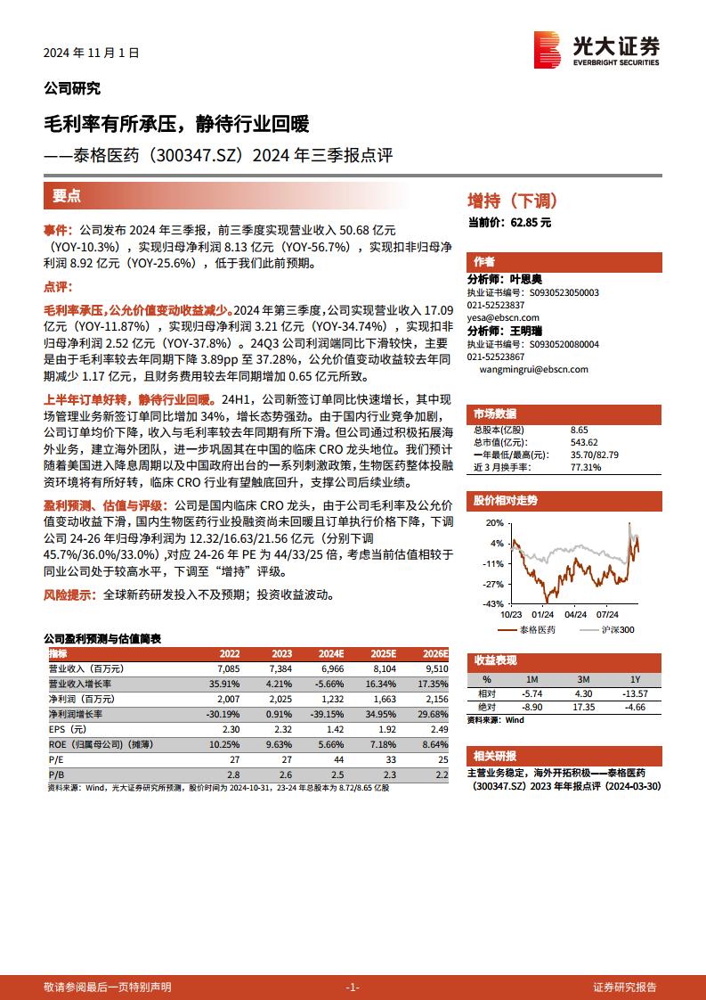 泰格医药(300347):2024年三季报点评:毛利率有所承压,静待行业回暖