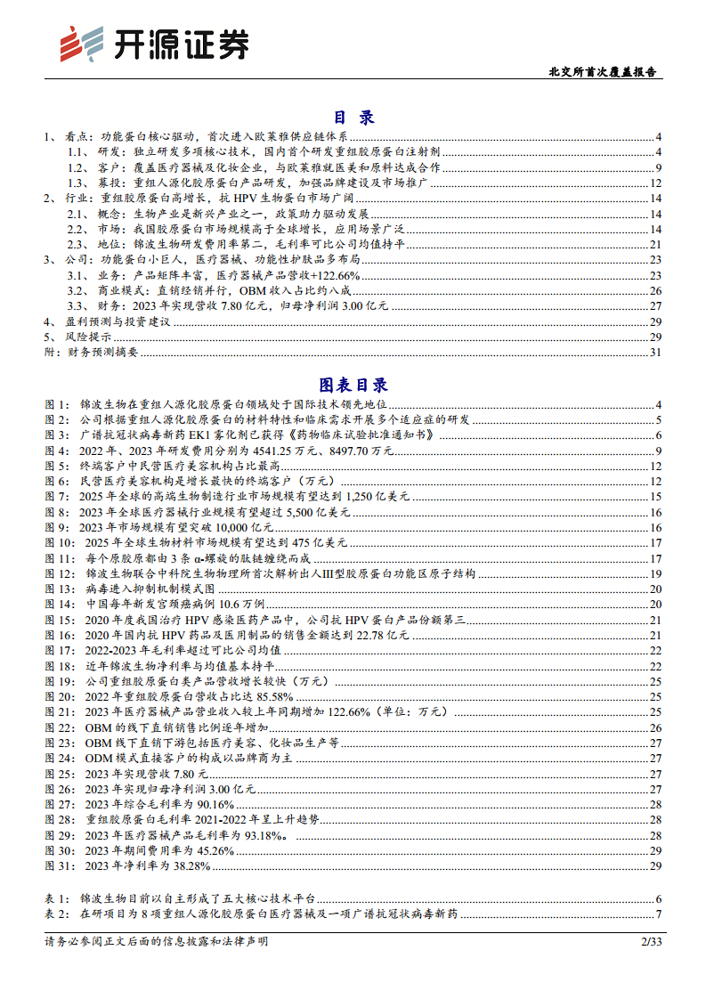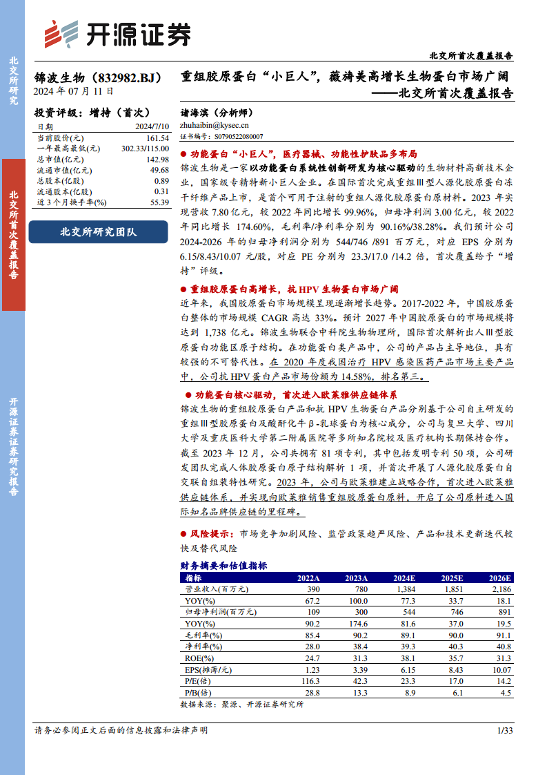 - 增持评级: 鉴于锦波生物在功能蛋白领域的创新研发能力、国际领先的技术地位、强劲的业绩增长以及广阔的市场前景,首次覆盖给予“增持”评级。