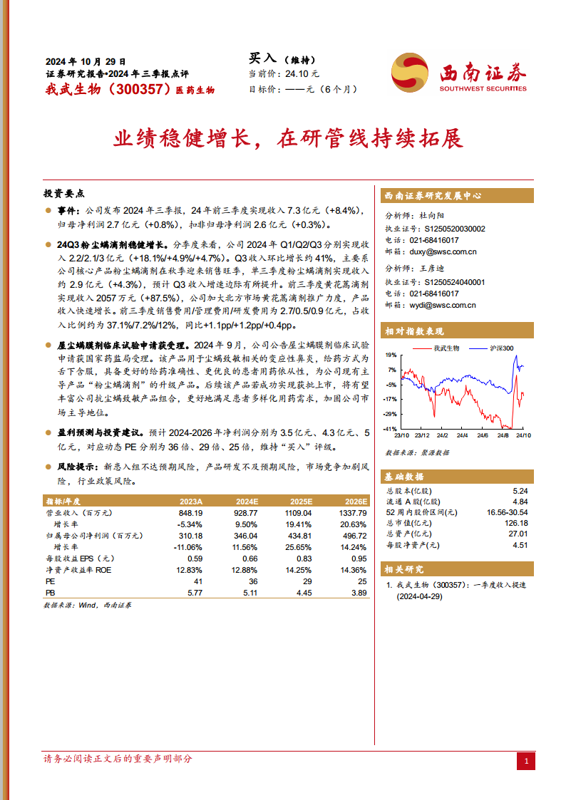 基于上述盈利预测和公司在核心产品及研发管线上的积极进展,西南证券维持对我武生物的“买入”评级。