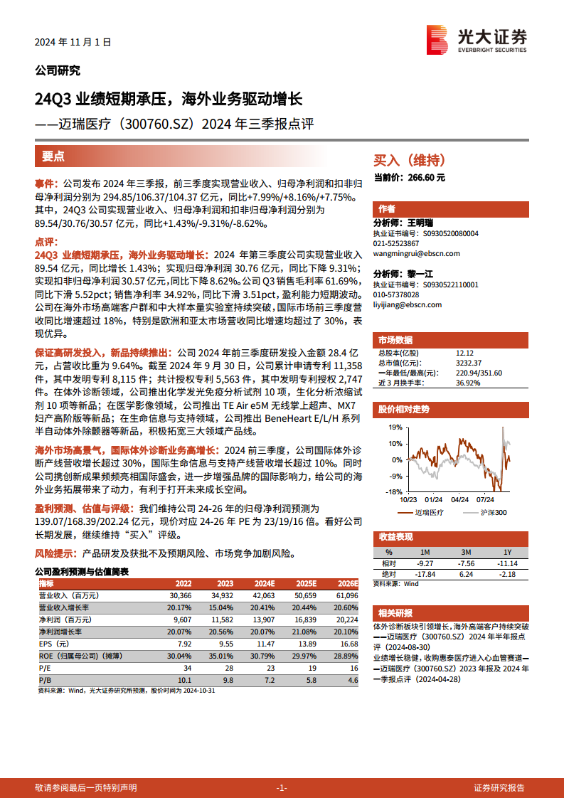 迈瑞医疗在2024年第三季度面临短期业绩压力,营收增速放缓且净利润同比下滑,毛利率和净利率均有所下降。然而,公司前三季度整体业绩仍保持增长,主要得益于其强劲的海外业务表现,特别是欧洲和亚太市场实现了超过30%的营收增长,国际体外诊断和生命信息与支持产线也分别实现了超过30%和10%的增长。公司持续保持高研发投入,前三季度研发投入达28.4亿元,占营收比重9.64%,并不断推出创新产品,积极拓宽三大核心业务领域的产品线。报告认为,尽管短期承压,迈瑞医疗凭借其在海外市场的持续突破、高端客户群的拓展以及强大的研发创新能力,具备广阔的长期成长空间。因此,报告维持了对公司2024-2026年归母净利润的乐观预测,并继续给予“买入”评级,同时提示了产品研发及市场竞争加剧的风险。