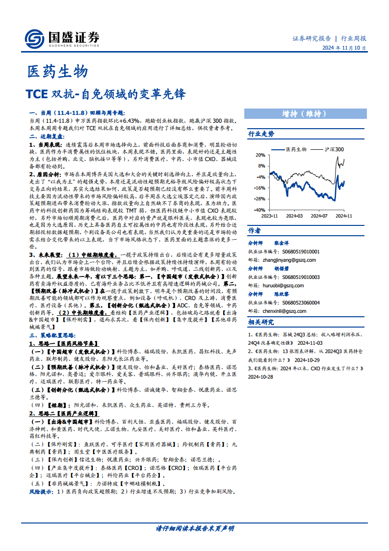 - 中短期维度: 预计市场将随一揽子政策持续出台而上一个台阶,医药板块有望继续受益于轮动映射和主题性机会,如并购、呼吸道、二线创新药等。