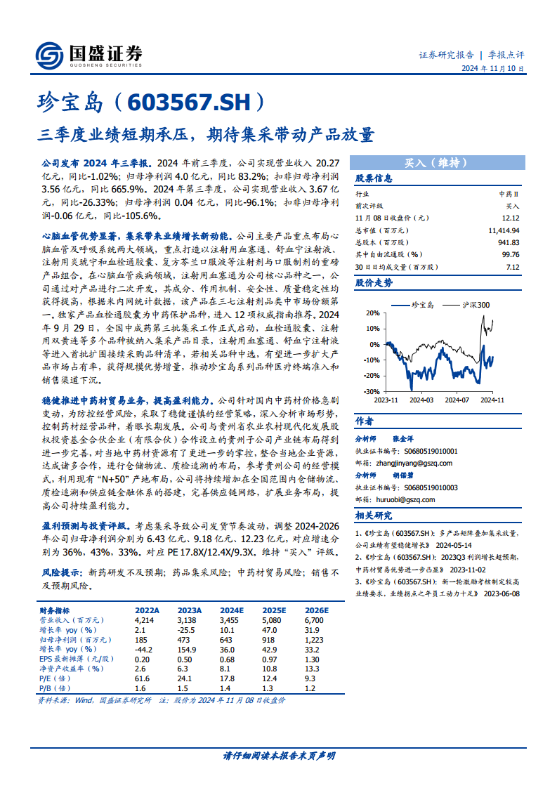 珍宝岛公司在2024年第三季度经历了短期业绩承压,主要表现为营收和净利润的同比显著下滑,这与集采发货节奏波动等因素相关。然而,从前三季度整体数据来看,公司归母净利润仍实现83.2%的强劲增长,显示出其核心盈利能力的提升。展望未来,公司在心脑血管领域的优势产品,特别是注射用血塞通和血栓通胶囊,有望通过国家中成药集采实现市场份额的扩大和销售渠道的下沉,从而获得规模优势。同时,公司通过与地方基金合作及完善全国供应链网络,稳健推进中药材贸易业务,进一步提升了盈利能力和风险抵御能力。国盛证券基于对集采带动产品放量和中药材贸易业务发展的预期,上调了公司未来三年的盈利预测,并维持“买入”评级,表明对公司长期增长前景的信心。投资者在关注公司增长潜力的同时,也需留意新药研发、集采、中药材贸易及销售等潜在风险。
