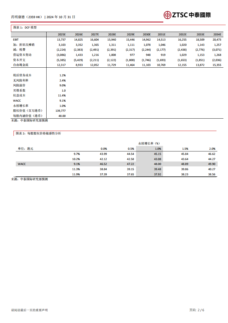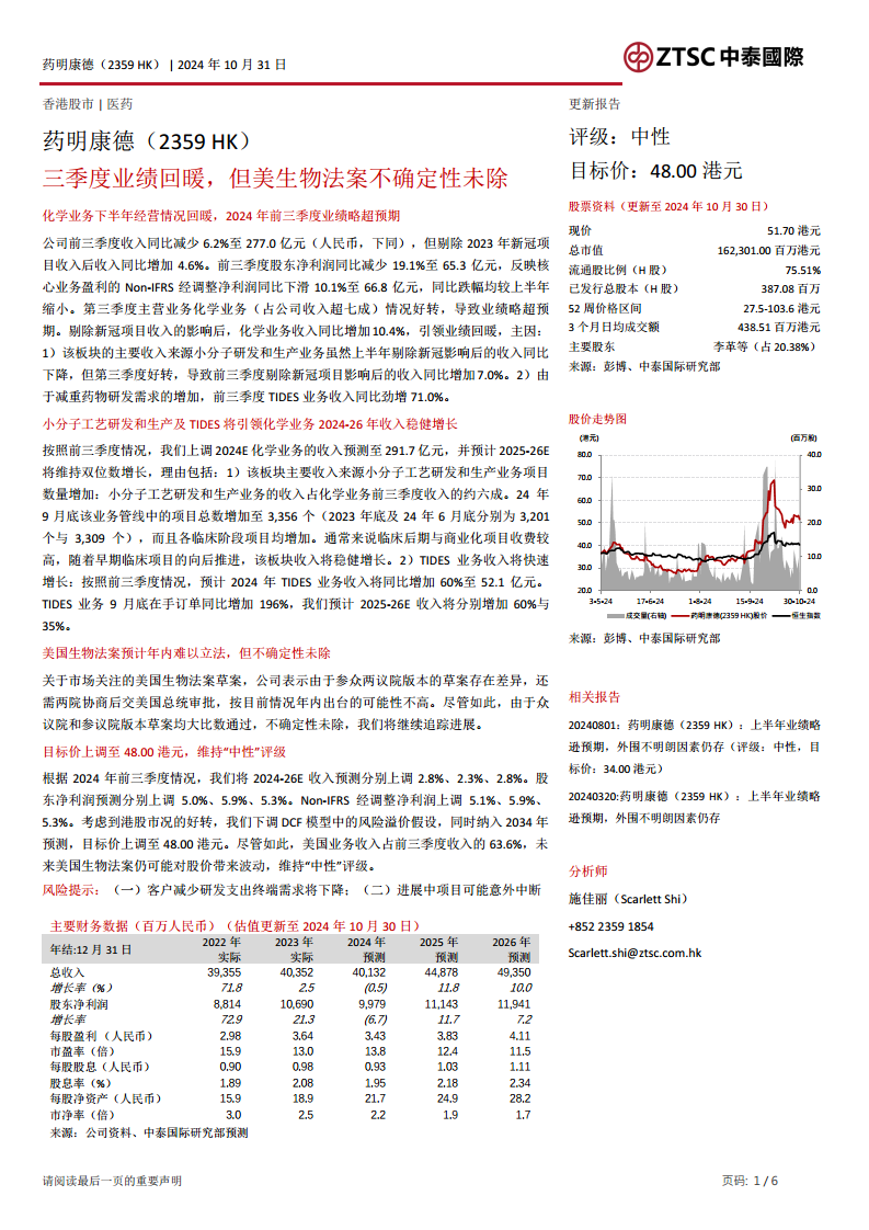 根据2024年前三季度情况,报告将2024-26E收入预测分别上调2.8%、2.3%、2.8%。股东净利润预测分别上调5.0%、5.9%、5.3%。Non-IFRS经调整净利润上调5.1%、5.9%、5.3%。考虑到港股市况好转,DCF模型中的风险溢价假设下调,并纳入2034年预测,目标价上调至48.00港元。尽管如此,由于美国业务收入占前三季度收入的63.6%,未来美国生物法案仍可能对股价带来波动,因此维持“中性”评级。