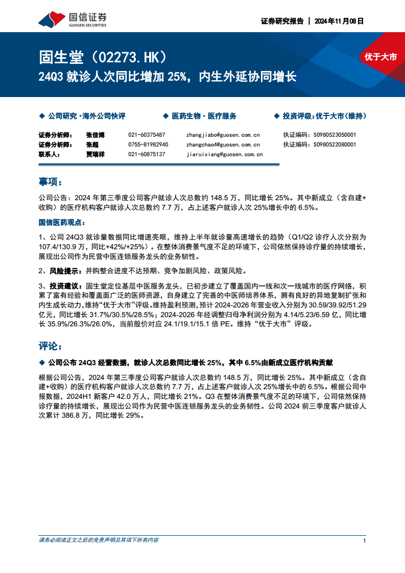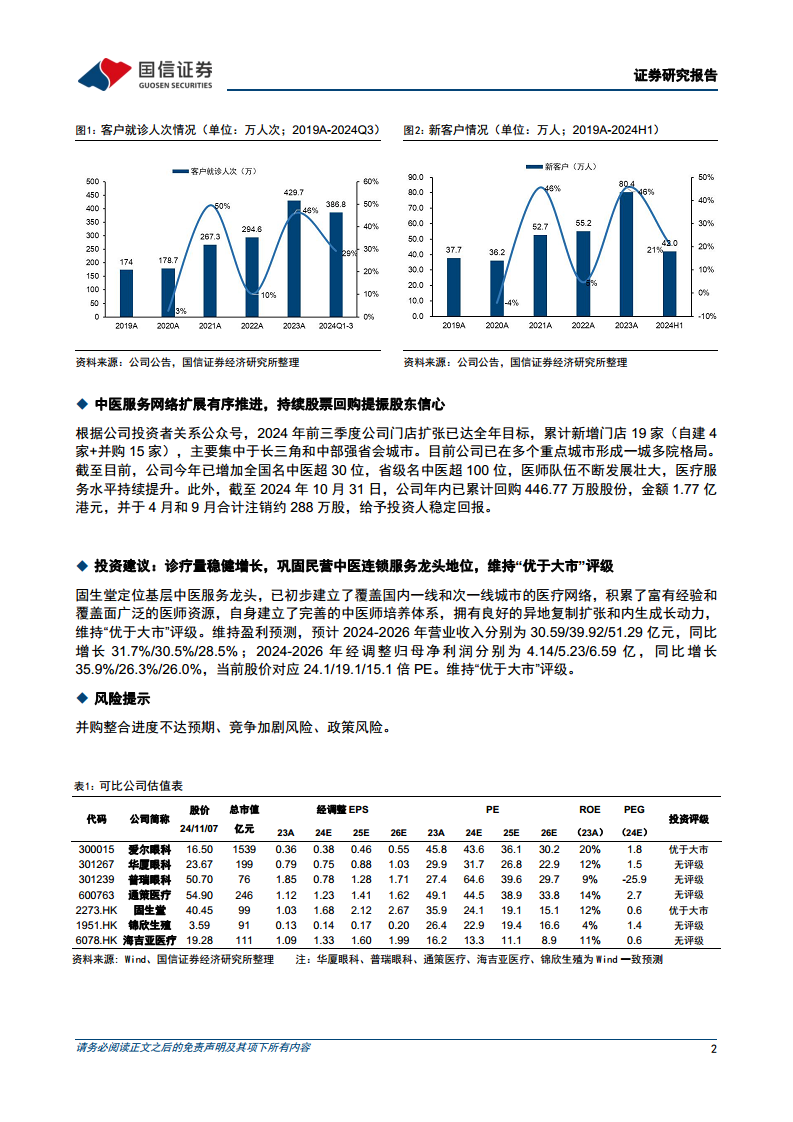 固生堂在2024年第三季度表现出强劲的增长势头,客户就诊人次同比增长25%,前三季度累计增长29%,充分彰显了其作为民营中医连锁服务龙头的强大业务韧性。公司通过积极的门店扩张策略(新增19家门店)和持续的医师团队建设,不断巩固其市场地位和提升服务质量。同时,公司通过股票回购行动,有效提振了市场和股东信心。国信证券基于固生堂稳健的增长态势、完善的医疗网络和医师资源,以及良好的内生外延增长动力,维持“优于大市”的投资评级,并对其未来三年的营收和经调整归母净利润增长持乐观预期。尽管存在并购整合、市场竞争和政策变化等潜在风险,但固生堂的战略布局和经营表现使其在当前市场环境下具备显著的竞争优势和投资价值。