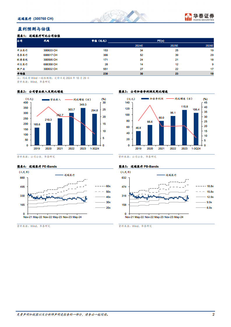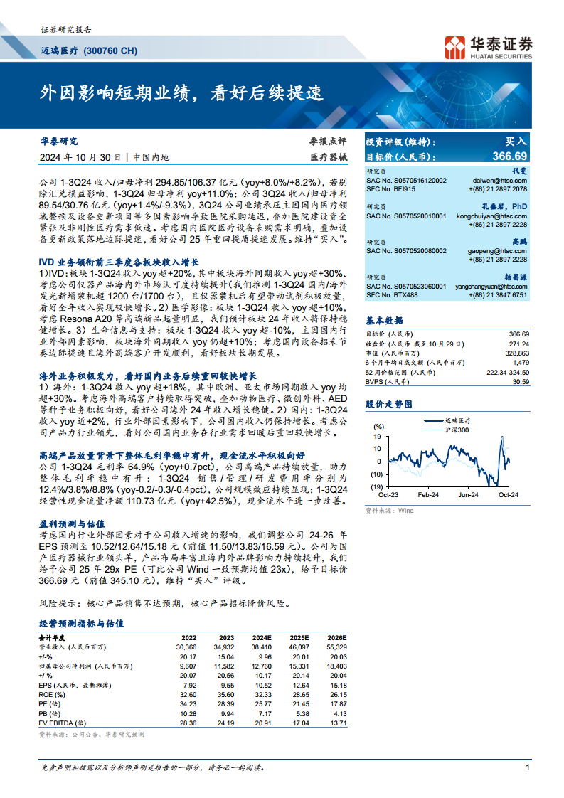 迈瑞医疗在2024年前三季度面临国内医疗行业整顿、采购延迟等外部挑战,导致第三季度业绩短期承压,但公司整体收入和归母净利润仍保持增长。其中,IVD业务和海外市场表现尤为强劲,高端产品放量带动毛利率提升,经营性现金流显著改善。尽管短期业绩受到影响,但鉴于国内医疗设备采购需求的明确性、设备更新政策的加速落地以及公司领先的产品力和持续的海外市场拓展,华泰研究维持对迈瑞医疗的“买入”评级,并看好公司在2025年重回提质提速发展。投资者需关注核心产品销售及招标降价风险。
