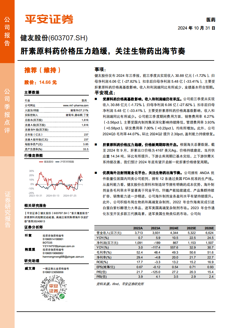 健友股份在2024年前三季度面临肝素原料药价格高基数带来的短期业绩压力,但肝素市场已显现触底回升迹象,预计新一轮价格修复周期即将开启。公司凭借其在海外注射剂市场的成本优势和商业化平台,以及在生物药领域的积极战略布局,特别是阿达木单抗生物类似药的出海,有望在未来实现业务结构的优化和盈利能力的持续提升。平安证券维持公司2024-2026年营收和净利润的增长预期,并维持“推荐”评级,认为伴随生物药出海,公司估值有望持续提升。然而,投资者仍需关注肝素价格波动、药品研发进度及国家政策变化等潜在风险。