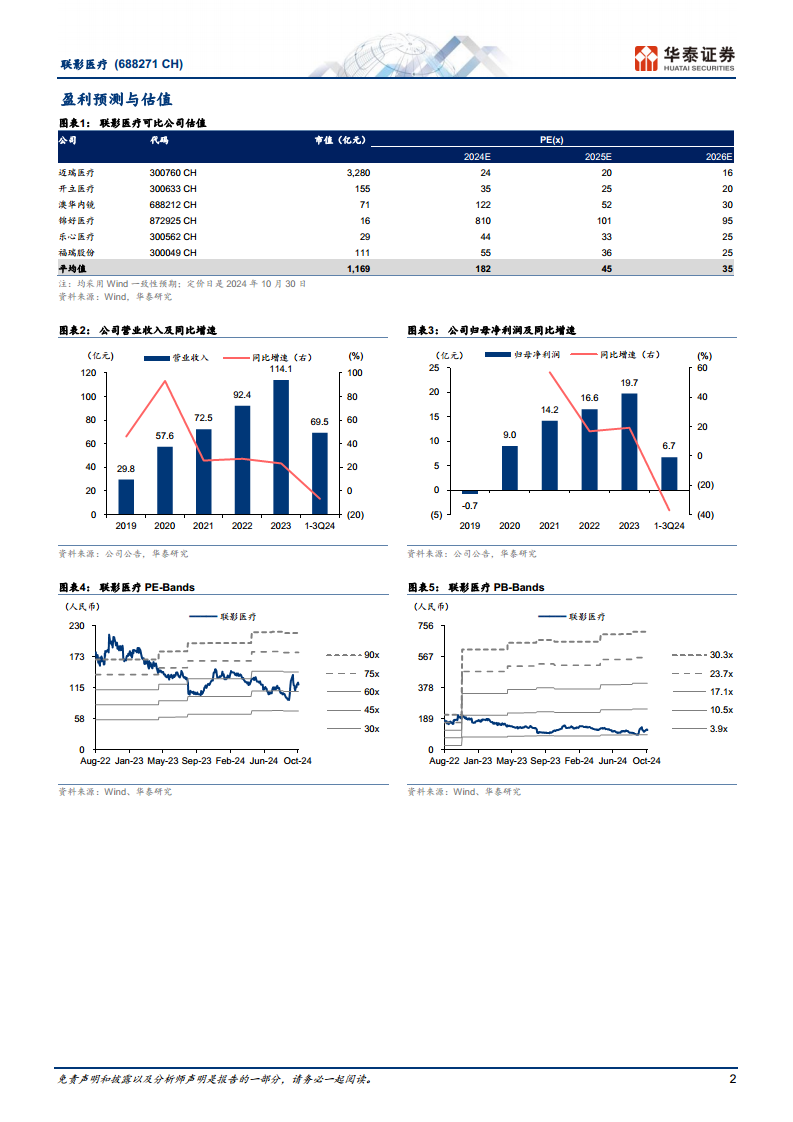 考虑到国内行业外部因素对公司收入增速和毛利率的影响,以及公司持续强化的销售及研发投入,华泰研究调整了公司2024-2026年的EPS预测至2.14元、2.87元和3.46元(前值为2.87元、3.47元和4.22元)。作为国产医学影像领域的龙头企业,联影医疗产品性能领先,国内外渠道持续完善。我们给予公司2025年54倍PE估值(可比公司Wind一致预期均值为45倍),并给予目标价154.90元(前值为152.37元),维持“买入”评级。报告同时提示了核心产品销售不达预期、市场竞争加剧以及核心技术人员流失等风险。