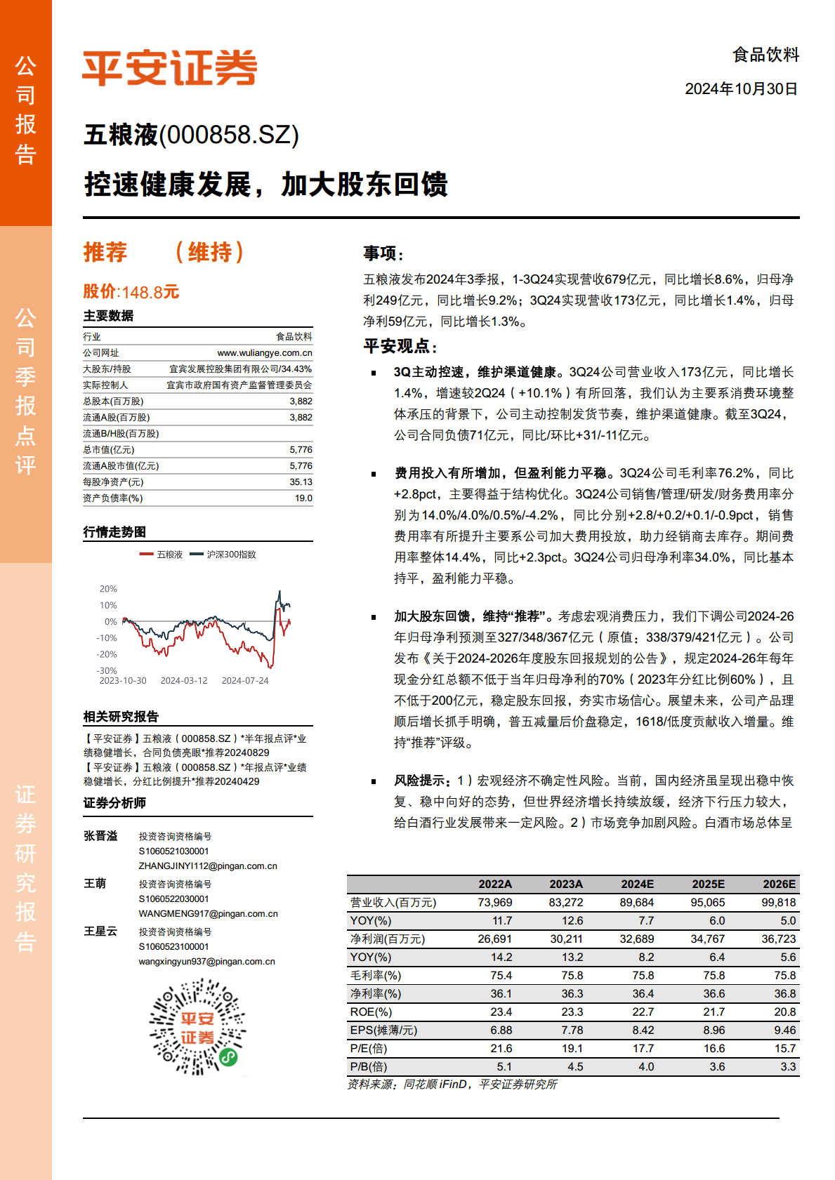 五粮液在2024年第三季度展现出稳健的经营策略,通过主动控制发货节奏以维护渠道健康,有效应对了宏观消费环境的挑战。尽管短期营收增速有所放缓,但公司盈利能力保持平稳,并通过产品结构优化提升了毛利率。公司积极回馈股东,将未来三年的现金分红比例提升至不低于70%且不低于200亿元,此举将显著增强投资者信心。展望未来,五粮液在产品结构优化和市场策略调整下,仍具备明确的增长潜力,但需警惕宏观经济不确定性、市场竞争加剧以及政策变动带来的风险。平安证券维持其“推荐”评级。
