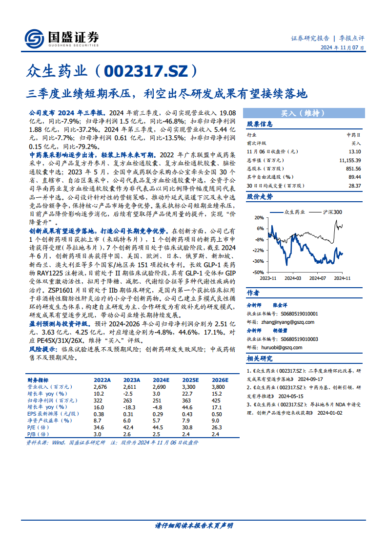 众生药业2024年前三季度业绩短期承压,主要受中药集采政策影响。然而,报告分析指出,集采带来的产品降价影响正逐步消化,公司正通过调整营销策略,有望实现“价降量升”。同时,公司在创新药研发方面持续投入并取得显著进展,多个创新药项目处于临床试验阶段,部分已获批上市或提交上市申请,如长效GLP-1类药物RAY1225和非酒精性脂肪性肝炎治疗药物ZSP1601。这些创新成果的逐步落地,预计将成为公司长期竞争优势和业绩增长的核心驱动力。基于对公司未来发展的积极展望,报告维持“买入”评级,并预计2024-2026年归母净利润将分别实现-4.8%、44.6%和17.1%的增长。