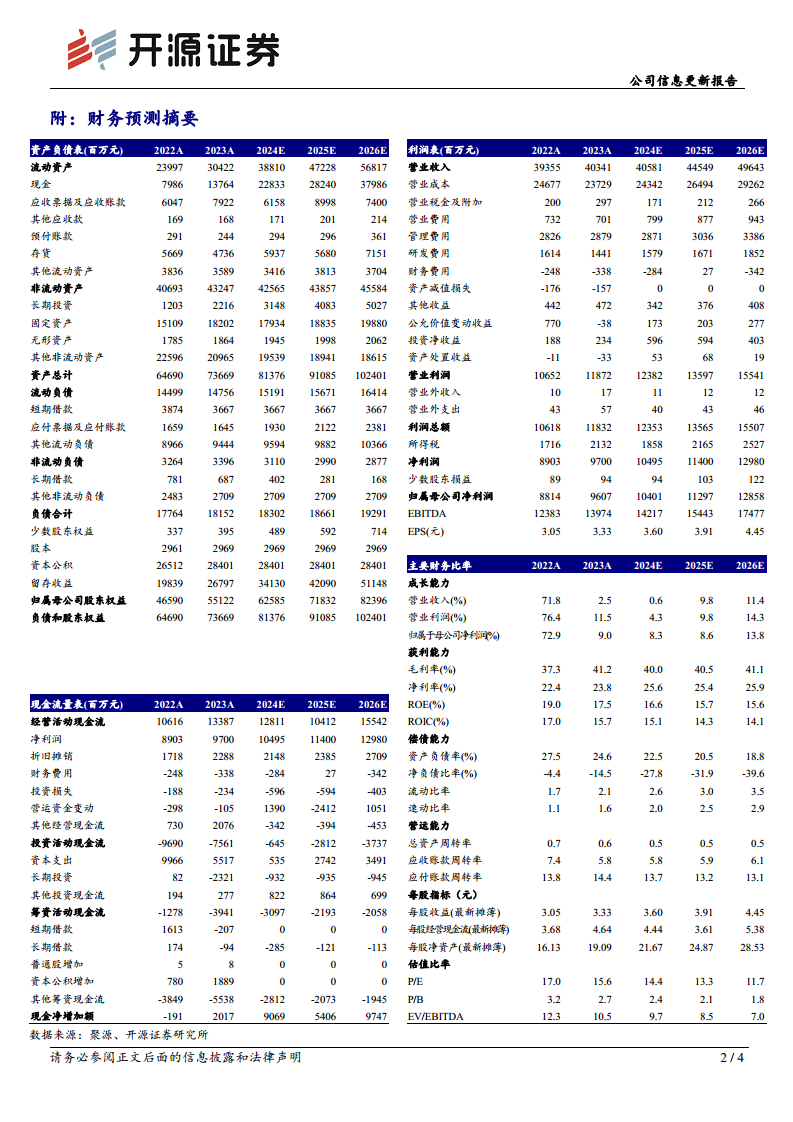 根据开源证券的财务预测,药明康德的营业收入预计在2024年至2026年分别达到405.81亿元、445.49亿元和496.43亿元,同比增长率分别为0.6%、9.8%和11.4%。归母净利润预计同期分别为104.01亿元、112.97亿元和128.58亿元,同比增长率分别为8.3%、8.6%和13.8%。 毛利率预计将从2024年的40.0%逐步提升至2026年的41.1%,净利率也将保持在25%以上。每股收益(EPS)预计持续增长,从2024年的3.60元增至2026年的4.45元。当前股价对应的市盈率(P/E)在未来三年内将逐步下降至11.7倍,显示出较好的估值吸引力。资产负债率预计将持续优化,从2024年的22.5%降至2026年的18.8%。