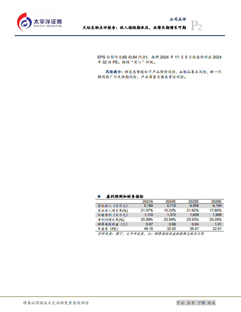 基于对天坛生物采浆能力、产品创新和费用管控的综合分析,太平洋证券对公司未来的业绩增长持乐观态度,并给出了具体的盈利预测: