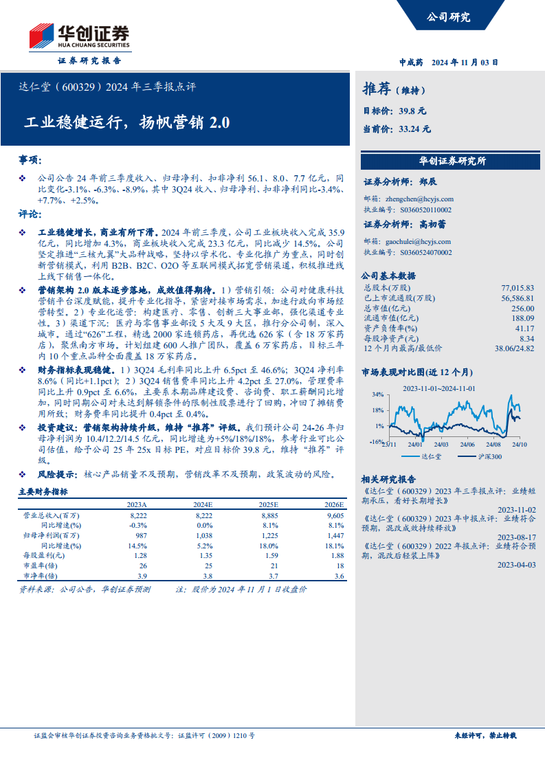 达仁堂(600329)在2024年前三季度面临短期业绩调整,但工业板块保持稳健增长,且第三季度净利润已实现同比正增长,显示出积极的复苏态势。公司正通过“三核九翼”大品种战略和营销架构2.0改革,深化渠道布局,提升专业化运营能力,以期实现长期可持续发展。财务指标方面,第三季度毛利率和净利率的提升表明盈利能力有所改善,尽管销售和管理费用有所增加,但这些投入被视为支持未来增长的关键。综合来看,尽管存在核心产品销量、营销改革成效及政策波动等风险,但鉴于公司积极的战略调整和未来业绩增长潜力,报告维持“推荐”评级。