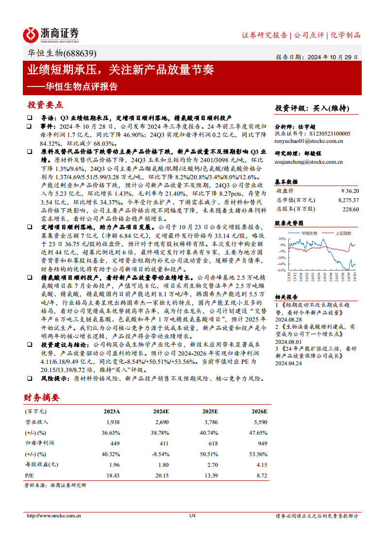 华恒生物(688639):点评报告:业绩短期承压,关注新产品放量节奏