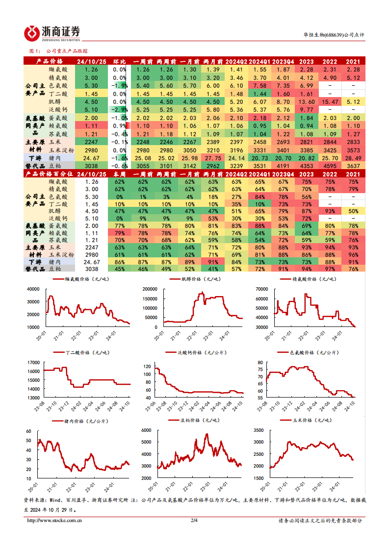 业绩下滑的主要原因在于原材料及替代品价格的下跌,进而带动公司主要产品价格的普遍下降。数据显示,24Q3玉米和豆粕的均价分别为2401元/吨和3098元/吨,环比分别下降1.3%和9.6%。受此影响,公司主要产品价格也出现不同程度的下滑:缬氨酸价格为1.37万元/吨,环比下降8.2%;肌醇价格为4.69万元/吨,环比下降20.8%;泛酸钙价格为5.51万元/吨,环比下降3.4%;色氨酸价格为5.99万元/吨,环比下降8.0%;精氨酸价格为3.28万元/吨,环比下降12.6%。 这些价格下跌叠加行业产能过剩和下游需求减少,导致公司新产品放量不及预期。24Q3公司营业收入为5.23亿元,环比增长1.43%,显示出营收增长的乏力。同时,毛利率环比下降8.27个百分点至21.40%,盈利空间受到挤压。存货环比增长34.37%至3.54亿元,可能反映了产品销售速度放缓。展望未来,报告认为随着生猪补库和饲料需求的增长,公司产品价格有望企稳并带动产销增长。