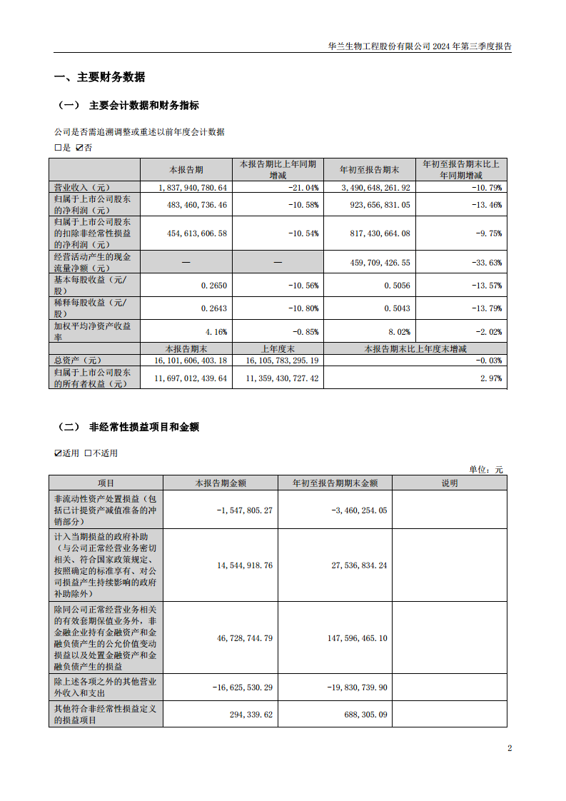 2024年第三季度,华兰生物实现营业收入18.38亿元,同比下降21.04%;归属于上市公司股东的净利润为4.83亿元,同比下降10.58%。年初至报告期末,公司累计营业收入34.91亿元,同比下降10.79%;归属于上市公司股东的净利润为9.24亿元,同比下降13.46%。扣除非经常性损益后的净利润分别为4.55亿元(同比下降10.54%)和8.17亿元(同比下降9.75%),显示主营业务盈利能力面临挑战。