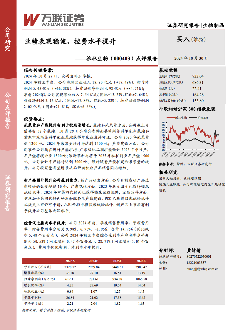 万联证券基于对行业和公司的深入研究,对派林生物的未来业绩持乐观态度,并维持“买入”评级。