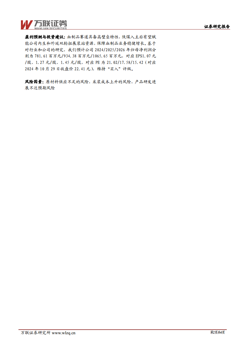 公司通过不断增加浆站数量、提升采浆量和扩大生产产能,为未来的投浆量增长和产品销售奠定了坚实基础。同时,多款在研新产品的快速推进,特别是第四代静丙和PCC等重磅产品的临床进展,预示着公司产品结构将进一步优化,有望带来新的利润增长点。在陕煤入主背景下,公司有望借助外部资源实现内生与外延式增长,持续拓展浆站资源,确保血制品业务的长期稳健发展。万联证券维持“买入”评级,反映了市场对公司未来增长潜力和盈利能力的积极预期。
