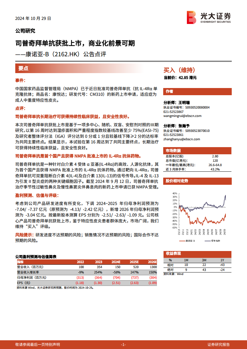 康诺亚-B的司普奇拜单抗获批上市,是公司发展历程中的一个里程碑事件,标志着首个国产IL-4Rα抗体药物进入市场。该药物在成人中重度特应性皮炎治疗中展现出良好的临床获益和安全性,且未来有望拓展更多适应症,市场潜力巨大。尽管公司短期盈利预测有所调整,但分析师基于其核心产品的市场前景,维持“买入”评级。投资者需关注产品商业化进程、销售表现以及潜在的研发和合作风险。