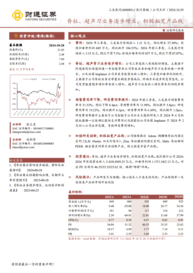 基于脊柱、超声刀业务的逐步增长和积极的产品线拓展,分析师对三友医疗的未来业绩持乐观态度。预计公司2024-2026年将实现营业收入5.43亿元、6.89亿元和9.25亿元,归母净利润分别为1.17亿元、1.54亿元和2.12亿元。对应PE分别为46.55倍、35.35倍和25.62倍,维持“增持”评级。同时,报告也提示了潜在风险,包括产品研发不及预期、核心技术人才流失的风险,以及产品结构单一和创伤类产品市场开拓的风险。