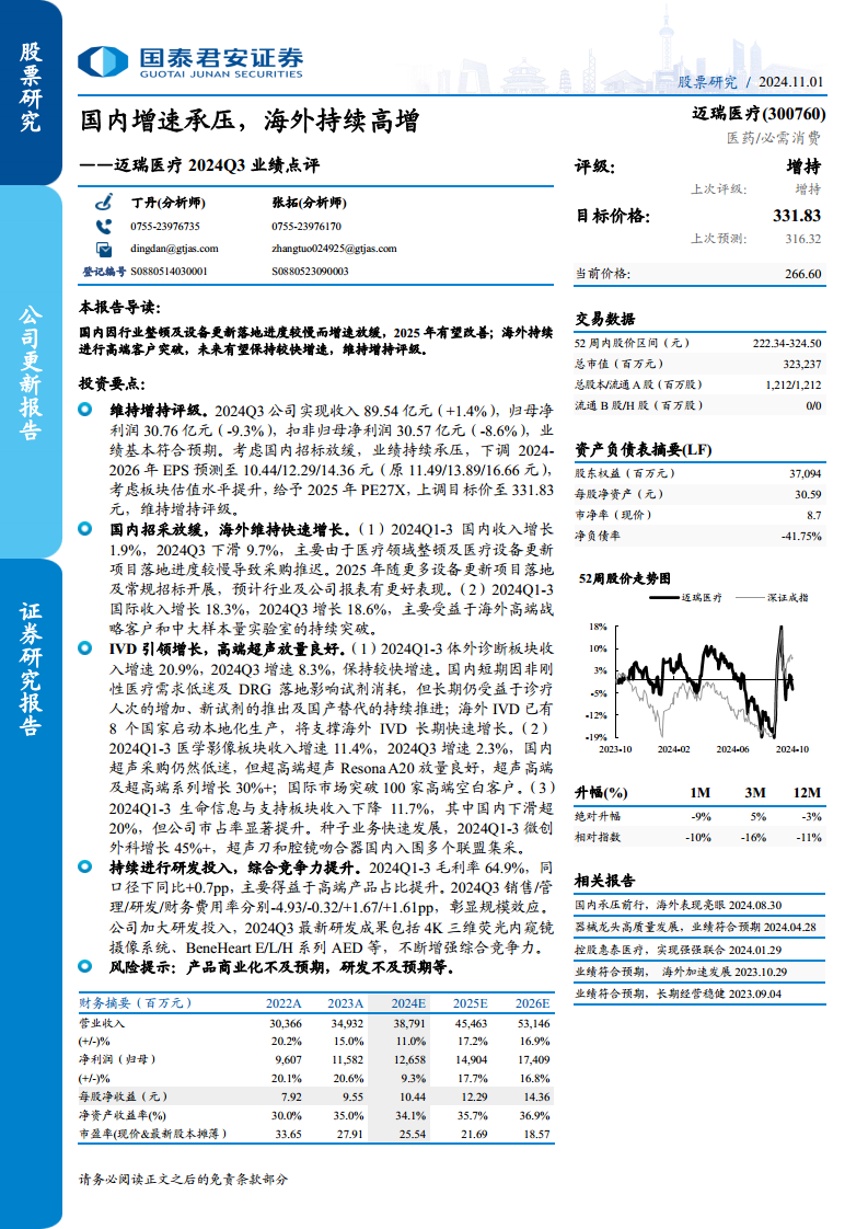 国泰君安证券维持迈瑞医疗“增持”评级,并基于国内招标放缓对业绩的持续压力,下调了2024-2026年的每股收益(EPS)预测至10.44/12.29/14.36元(原预测为11.49/13.89/16.66元)。尽管如此,考虑到板块估值水平的提升,目标价上调至331.83元(原316.32元)。2024年第三季度,公司实现收入89.54亿元,同比增长1.4%;归母净利润30.76亿元,同比下降9.3%;扣非归母净利润30.57亿元,同比下降8.6%,业绩基本符合市场预期。