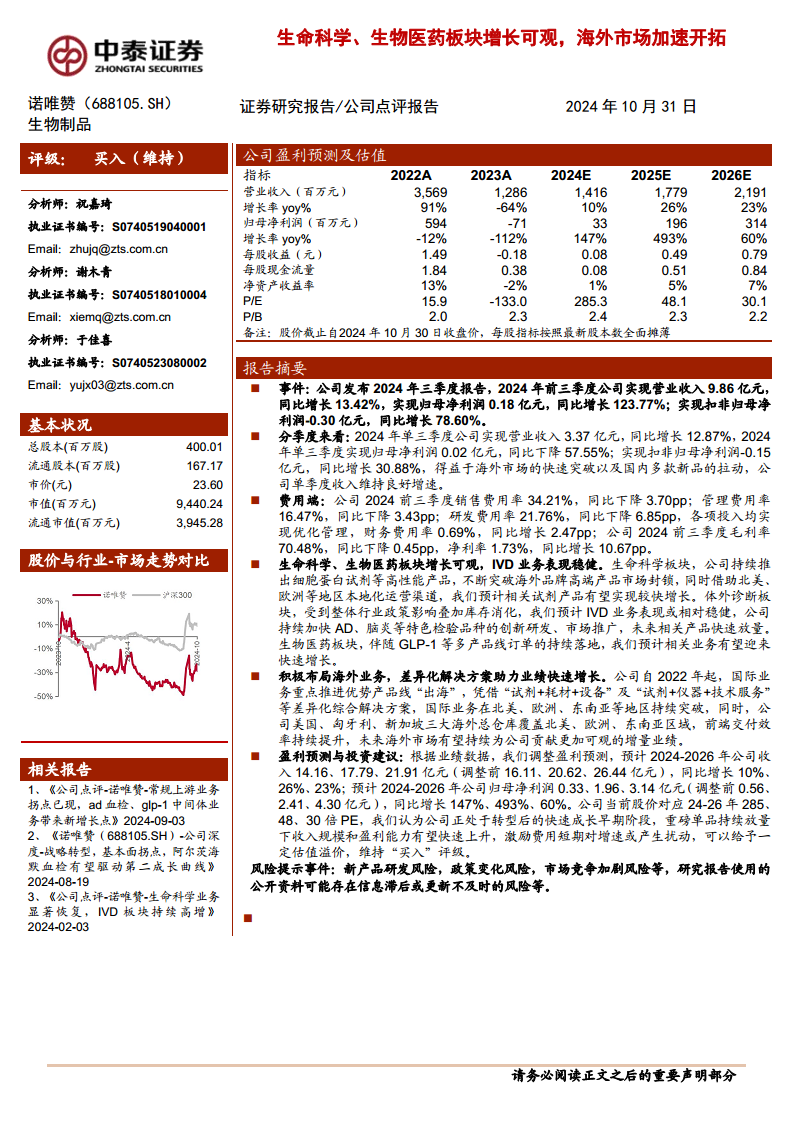 诺唯赞在2024年前三季度展现出稳健的业绩增长态势,营业收入和归母净利润均实现显著提升。这主要得益于公司在生命科学和生物医药板块的持续创新,以及在海外市场的积极拓展和差异化解决方案的成功应用。尽管第三季度归母净利润有所波动,但扣非归母净利润的增长和各项费用率的优化管理,表明公司运营效率正在提升。公司通过“出海”战略和全球仓储布局,有效提升了国际业务的交付效率和市场渗透率,预计海外市场将成为未来业绩增长的重要驱动力。尽管盈利预测有所调整,但分析师仍维持“买入”评级,认为公司正处于转型后的快速成长阶段,重磅单品的放量和盈利能力的提升值得期待。