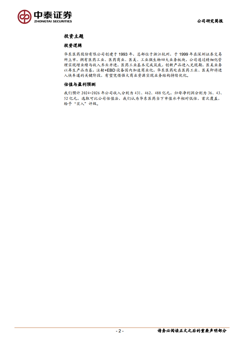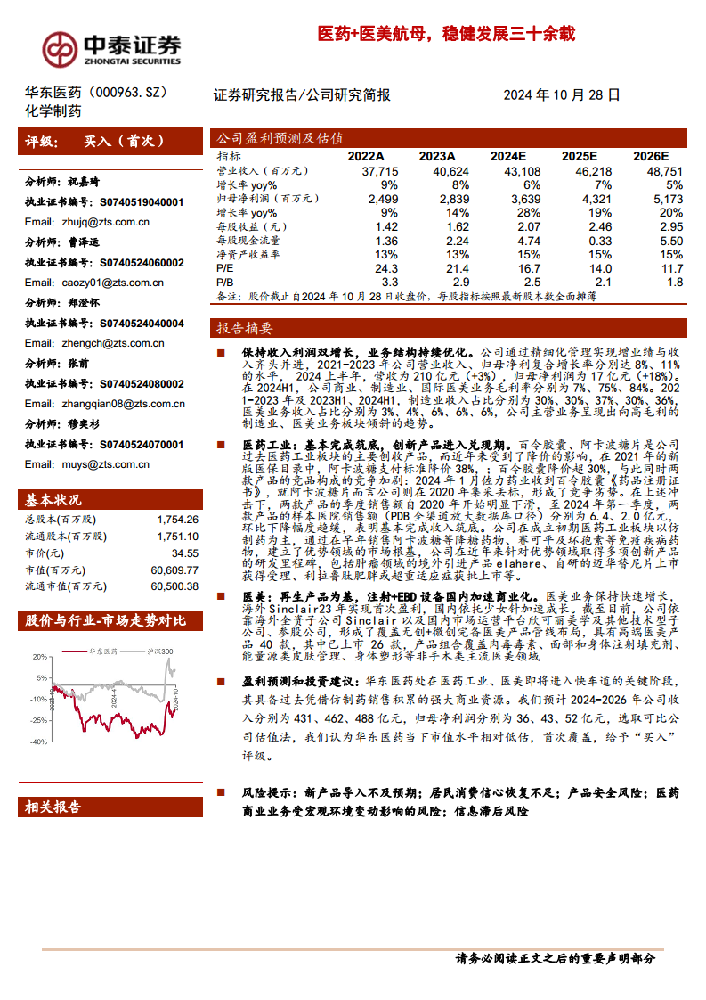 基于对医药工业、医药商业和医美业务的关键假设,中泰证券预计华东医药未来业绩将持续增长。