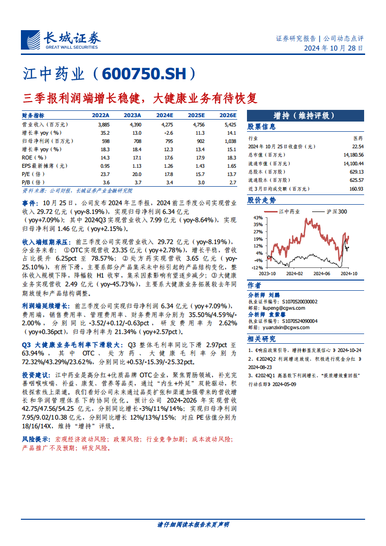 本报告对江中药业2024年三季报进行了深入分析,指出公司在报告期内实现了归母净利润的稳健增长,前三季度同比增长7.09%,主要得益于核心OTC业务的稳定表现和有效的费用控制,使得归母净利率提升2.57个百分点至21.34%。然而,公司整体营收面临短期压力,前三季度同比下降8.19%,其中处方药业务受集采影响下滑25.10%,大健康业务更是大幅下降45.73%,且毛利率显著承压,成为拖累整体业绩的关键因素。尽管面临挑战,分析师仍看好江中药业作为优质OTC品牌,通过“内生+外延”战略拓展品类和渠道,并借助华润管理体系实现协同优化,预计未来营收和利润将恢复增长。基于对公司未来业绩的积极预期,报告维持“增持”评级,并提示了宏观经济、政策、市场竞争等潜在风险。