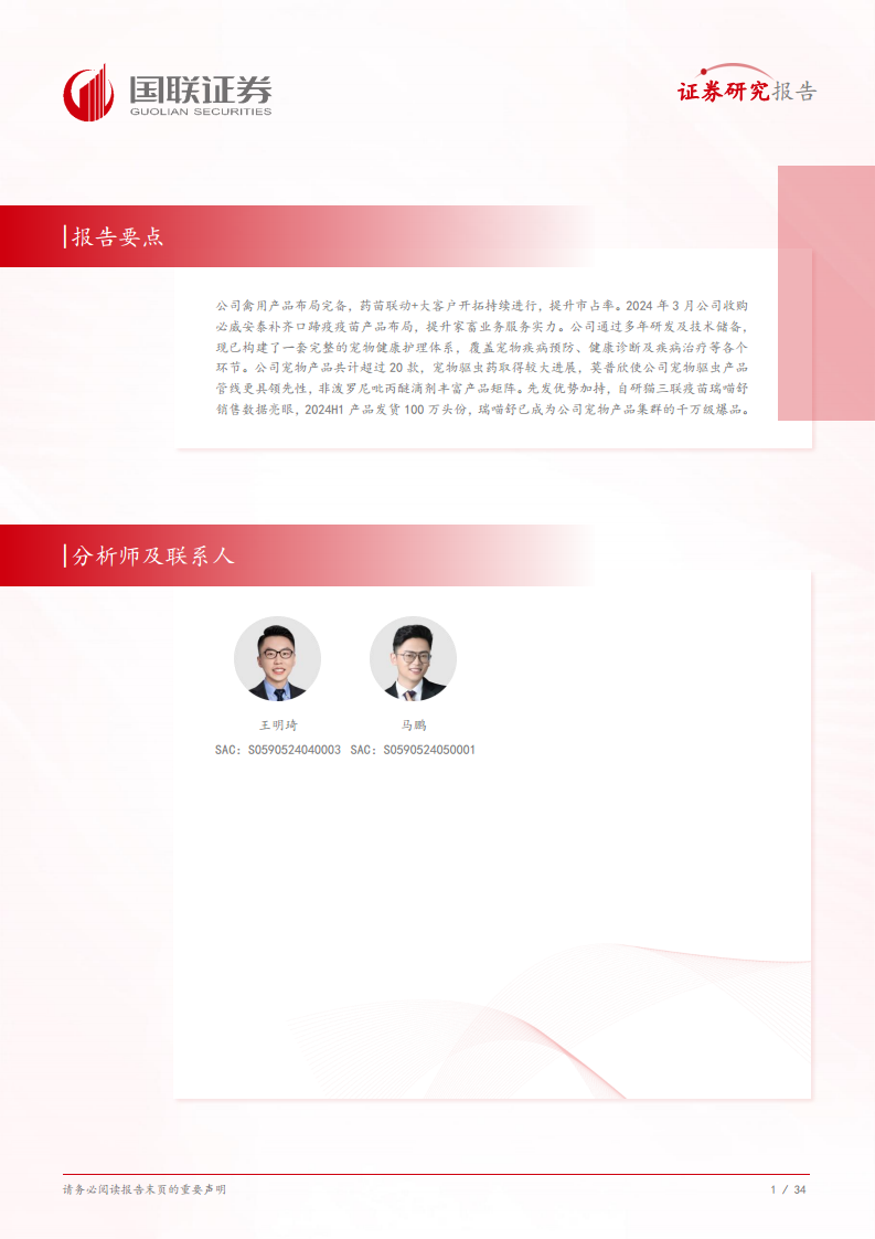 瑞普生物通过多年研发及技术储备,已构建了一套完整的宠物健康护理体系,覆盖宠物疾病预防、健康诊断及疾病治疗等各个环节,产品组合超过20款。在宠物驱虫药领域,公司取得了较大进展,2022年上市的莫普欣(可同时驱除犬猫体内外28种寄生虫)和非泼罗尼吡丙醚滴剂,有效打破了进口产品对宠物驱虫药市场的垄断格局。在宠物疫苗方面,公司自研的猫三联疫苗“瑞喵舒”于2024年1月18日获得兽药产品批准文号,成为国产猫三联疫苗第一个上市销售品种,具备先发优势。瑞喵舒通过筛选国内流行毒株进行研发,保护率更优,2024年上半年产品发货100万头份,已成为公司宠物产品集群的千万级爆品。公司通过“优质经销商+三瑞齐发”(瑞普生物、瑞派宠物医院、中瑞供应链战略合作)构建了广泛的销售网络,覆盖全国5000多家宠物医院,并积极拓展天猫、京东等线上电商平台,确保产品有效市场渗透和便捷可及性。