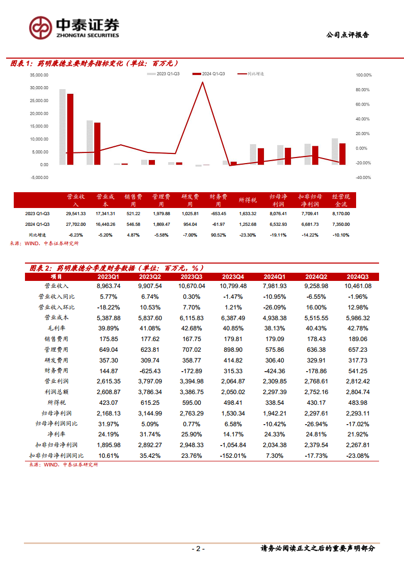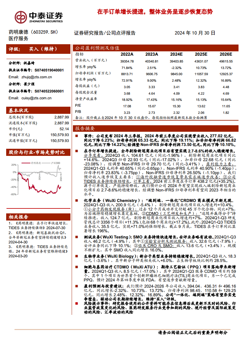 药明康德在2024年前三季度面临新冠商业化项目带来的短期业绩压力,导致营收和归母净利润同比下降。然而,剔除新冠项目后,公司业务呈现出显著的复苏态势,尤其是在手订单同比增长35.2%至438.2亿元,为未来增长提供了坚实保障。海外投融资的逐步恢复以及TIDES业务的强劲增长是推动公司业务恢复的关键因素,其中TIDES业务收入同比增长71.0%,在手订单同比增长196%。化学业务的CDMO项目管线持续扩张,生物学业务的新分子类型收入稳健增长,细胞与基因治疗CTDMO业务也有望随着PPQ项目的落地贡献新增量。尽管短期业绩波动,公司盈利能力保持稳定,分析师维持“买入”评级,并预测2024-2026年公司营收和归母净利润将实现稳健增长,体现了对公司“一体化、端到端”策略和长期发展潜力的信心。同时,报告也提示了包括监管政策、行业竞争、境外经营和汇率波动等潜在风险。
