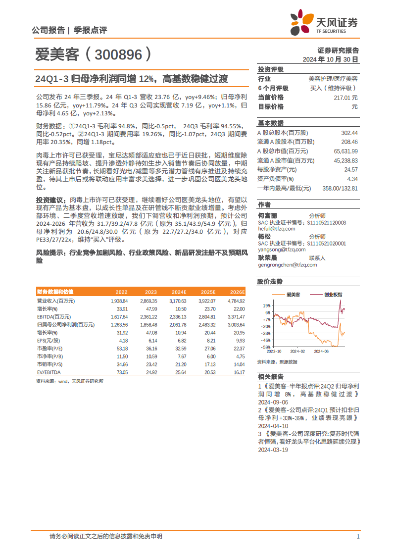 爱美客在2024年前三季度展现了稳健的业绩增长,尤其在较高基数下保持了良好的发展态势。公司在产品创新方面持续发力,肉毒素上市许可的受理和宝尼达新适应症的获批预示着未来业绩增长的新动能。尽管短期内受外部环境影响,业绩预期有所调整,但公司作为医美龙头的核心竞争力依然强劲,多元化产品管线的布局将为其长期发展提供坚实支撑。维持“买入”评级,建议投资者关注公司新品上市节奏及多元业务拓展。