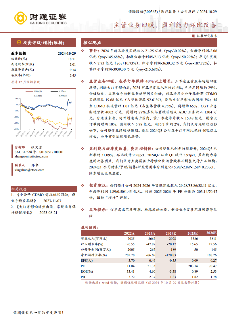 博腾股份在2024年前三季度虽面临整体业绩压力,但第三季度数据显示其主营业务已实现显著回暖,尤其在剔除大订单影响后,收入增长强劲。公司在手订单保持高速增长,为未来业绩提供了坚实基础。同时,通过优化运营效率和调整产品结构,公司盈利能力逐季度改善,毛利率显著提升,且费用控制效果显著。尽管2024年预计仍将亏损,但分析师预测公司将在2025年和2026年恢复盈利,并维持“增持”评级,表明对公司未来发展持积极态度,但需关注订单需求、地缘政治及新兴业务发展等潜在风险。