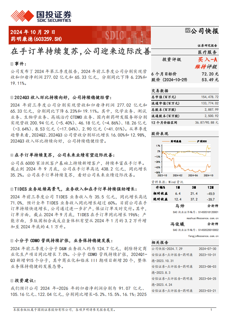公司未来业绩增长的核心驱动力在于其强劲的在手订单复苏和创新业务(特别是TIDES业务)的高速增长。截至2024年9月底,在手订单总额显著增长,为后续业绩释放提供了坚实保障。同时,TIDES业务的爆发式增长及其产能的持续扩张,以及小分子CDMO管线的稳健发展,共同构成了公司未来业绩增长的重要引擎。